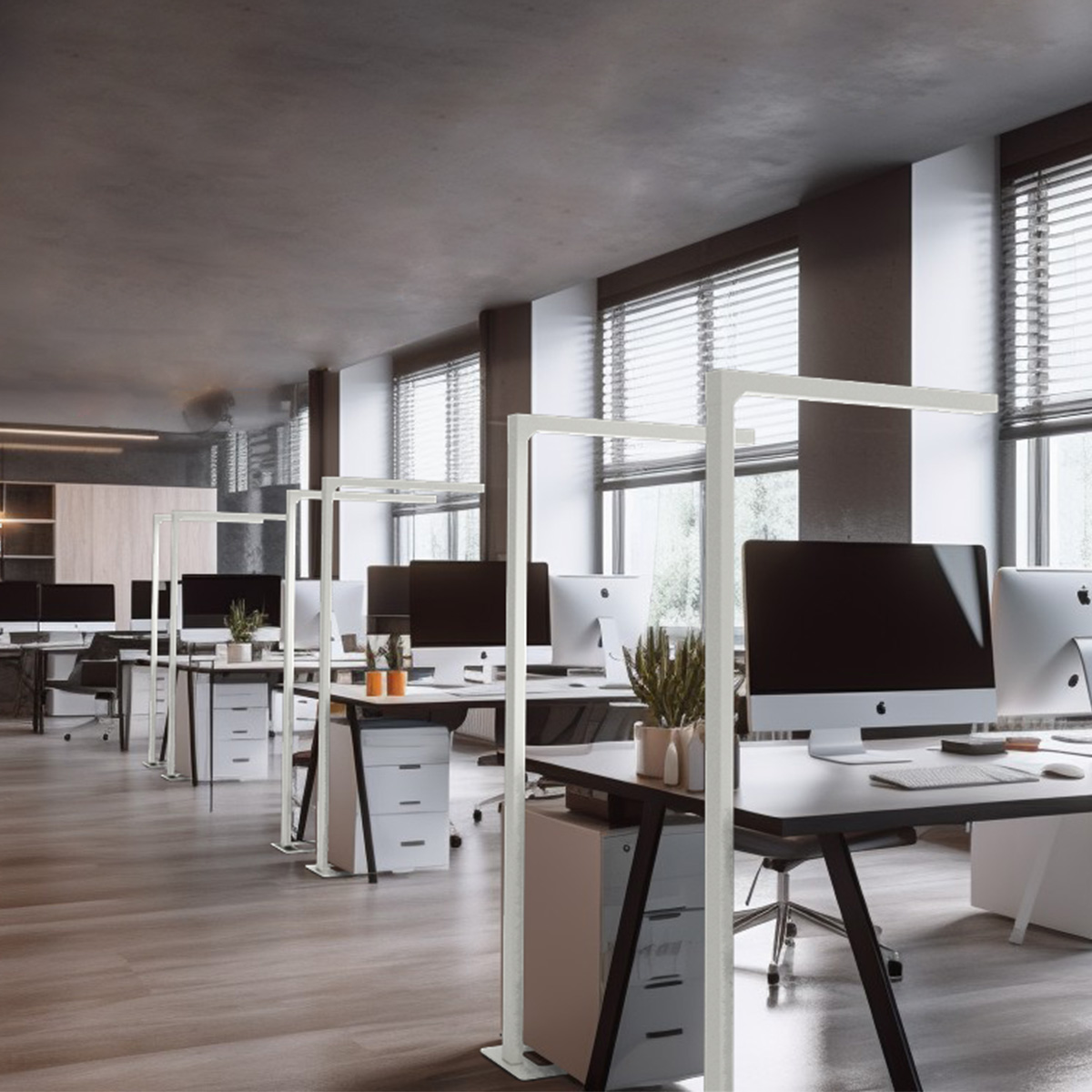 Available in white, light gray, and black, the minimalist design seamlessly integrates with a variety of office furniture. With 80W power and an A-class energy efficiency rating, these floor lamps provide both direct and indirect lighting and boast a long service life of 50,000 hours.